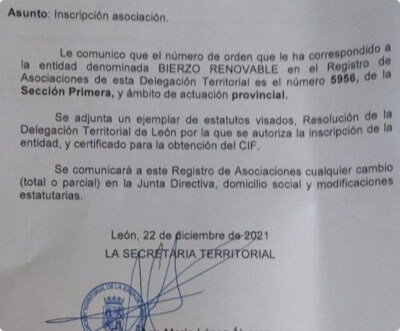 Hoy hemos recibido la notificación de la inscripción de Bierzo Renovable en el Registro de Asociaciones de León.